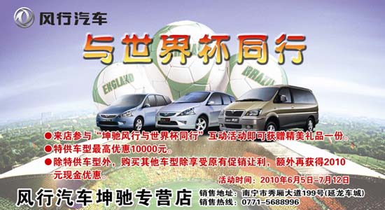 小編從秀廂大道風(fēng)行汽車南寧坤馳汽車4S店獲悉,為迎“2010世界杯”現(xiàn)購任一款車型除享受原有優(yōu)惠,還可再獲得2010元的現(xiàn)金優(yōu)惠,感興趣的朋友可到店詳詢:砍價(jià)咨詢熱線:0771-5688996【南寧坤馳】