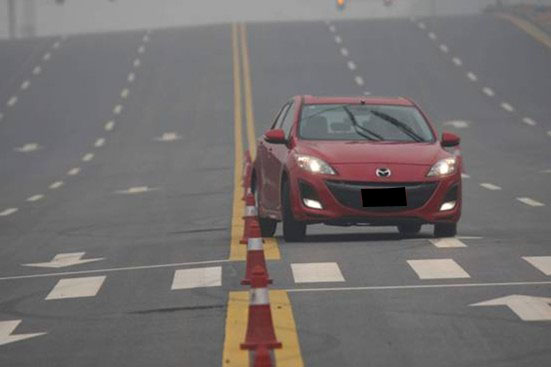去到繞樁場(chǎng)地之前會(huì)經(jīng)過(guò)一段大貨車經(jīng)常碾壓的路段,路上的細(xì)碎坑洞很多,換作以前的Mazda3一定是一段欲仙欲死的震蕩經(jīng)歷,但是本代的Mazda3就進(jìn)步了許多,通過(guò)將前懸的齒輪支架安裝從2點(diǎn)式改成3點(diǎn)式,將后懸的中央橫梁優(yōu)化,對(duì)路面的細(xì)碎也能夠較好的過(guò)濾,不再是像從前那么死硬。方向盤總體來(lái)說(shuō)有些重手,在中低速下路面的反饋十分豐富,能夠籍以指引車頭精確的轉(zhuǎn)向,但是隨著速度加快,道路回饋會(huì)有些損失。