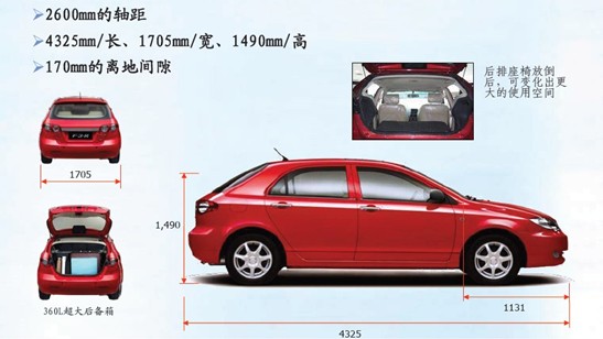 提到兩廂車,人們?cè)谫澝榔鋾r(shí)尚外形的同時(shí),往往會(huì)惋惜其空間不足、實(shí)用性不高。F3R給車市帶來(lái)“大兩廂”的全新概念,讓你無(wú)論是出門旅行還是逛街購(gòu)物都不愁沒有儲(chǔ)物空間。F3R擁有同級(jí)車中無(wú)可比擬的寬大車身,其長(zhǎng)4325毫米、寬1705毫米、高1490毫米,而軸距竟達(dá)到2600mm,F(xiàn)3R的后備箱采用掀背開啟式廂門,容積達(dá)到360L,頗具實(shí)用價(jià)值,如此闊綽的空間,完全可以媲美普通三廂車,堪比中高級(jí)車標(biāo)準(zhǔn)。