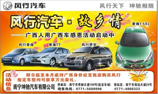 風行天下,坤馳相隨,風行汽車故鄉(xiāng)情——廣西人用廣西車感恩活動啟動中。即日起至本月底凡持廣西身份證至店購買風行指定車型均可獲享萬元豪禮。