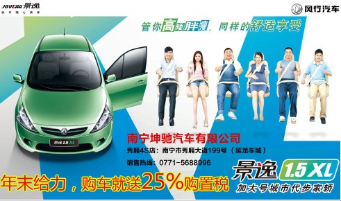 年末給力-購景逸1.5XL就送25%購置稅,風行汽車南寧坤馳店讓你開開心心過大年,年后再提車,避免購置稅回調所帶來的額外支出。