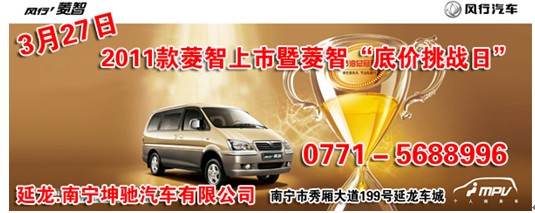 3月27日南寧坤馳——菱智2011款上市活動(dòng)暨菱智“底價(jià)挑戰(zhàn)日”2011款菱智上市將在南寧坤馳秀廂店盛大開啟,讓利幅度絕對(duì)讓你不會(huì)后悔,即日起凡是報(bào)名參加活動(dòng)的客戶均可獲得精美禮品一份。