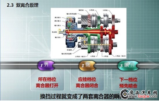 我們以大眾出品的DSG為例,它結(jié)合以上兩種變速器的優(yōu)點,沒有使用變矩器,轉(zhuǎn)而采用兩套離合器,通過兩套離合器的相互交替工作,來到達無間隙換擋的效果。兩組離合器分別控制奇數(shù)擋與偶數(shù)擋,具體說來就是在換擋之前,DSG已經(jīng)預先將下一擋位齒輪嚙合,在得到換擋指令之后,DSG迅速向發(fā)動機發(fā)出指令,發(fā)動機轉(zhuǎn)速升高,此時先前嚙合的齒輪迅速結(jié)合,同時第一組離合器完全放開,完成一次升擋動作,后面的動作以此類推。
