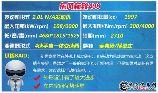 至于動(dòng)力方面,1.6L和2.0L兩個(gè)老搭檔依舊是主力,不過2.0L換裝了新的氣門正時(shí)結(jié)構(gòu),廠家解釋是帶自動(dòng)除積碳功能的金屬節(jié)氣門,并且還對(duì)進(jìn)氣歧管進(jìn)行了優(yōu)化,看樣子,2.0L車主在日后的維修費(fèi)用上可以有所減少。傳動(dòng)系統(tǒng)依舊是老款的五速手動(dòng)和四速自動(dòng)變速箱,這一點(diǎn)有些拖了408的后腿。
