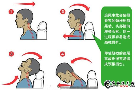 1、防止追尾撞擊事故中的頸椎傷害,關(guān)鍵在于發(fā)生撞擊事故時(shí)讓乘員的頭部和上身一起和諧地運(yùn)動(dòng)。測試表明在座椅頭枕有足夠的高度,身體、頭部都有效接觸座椅及頭枕情況下,碰撞給車帶來的加速度,將通過座椅靠背及頭枕同時(shí)傳遞給身體和頭部,從而有效降低碰撞時(shí)對頸椎的傷害。換句話說,乘車過程中我們要盡量保持整個(gè)身體(包括頭部)與座椅的充分接觸。