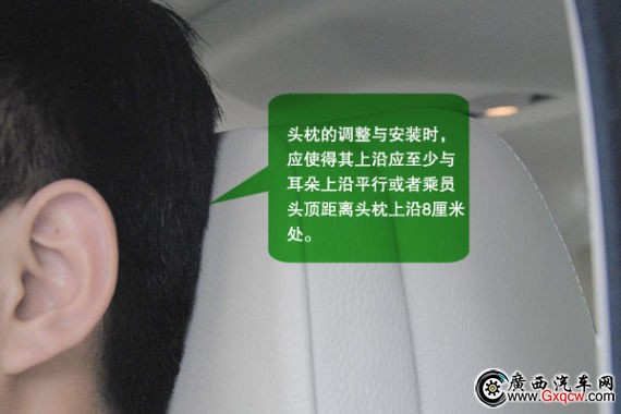 3、頭枕應(yīng)安裝在至少與耳朵上沿平行的地方或者乘員頭下約8.89厘米的地方。頭枕調(diào)整完畢后,牢牢固定頭枕,使頭枕不晃動(dòng)。
