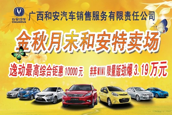 編輯了解到,2012年10月28日,長安轎車廣西和安4S店舉辦“金秋月末長安轎車特惠場”活動,逸動最高優(yōu)惠10000元,奔奔MINI限量版勁爆價3.19萬元。兩人同行即可參加團購選購多種千元精品優(yōu)惠禮包;省心包牌價格;準備買車的您千萬不要錯過全車系優(yōu)惠促銷,更多種金融優(yōu)惠購車方案任您選擇,讓您購車更省心、更安心;