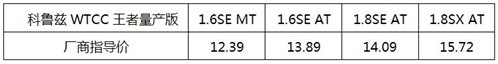 雪佛蘭科魯茲WTCC王者量產(chǎn)版價(jià)格(單位:萬元)