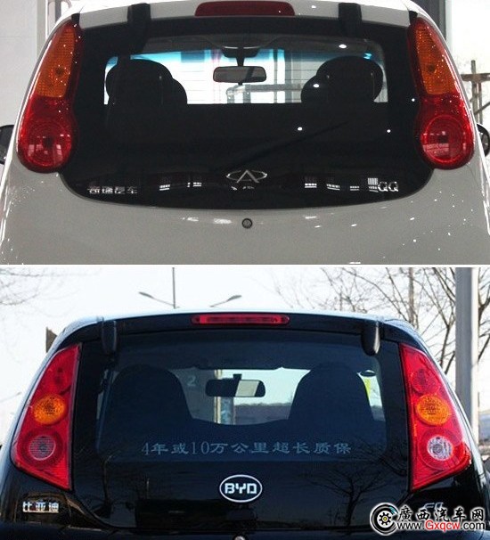 比亞迪F0與新QQ的尾巴很像,如果沒有任何標(biāo)識,還真看不出誰是誰。新QQ的尾部裝備了兩個倒車?yán)走_(dá),比較厚道,增加了泊車時的便利性。比亞迪F0沒有裝備倒車?yán)走_(dá),這點(diǎn)做的不如新QQ。