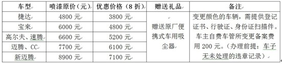 ● 免費(fèi)代辦車管所車輛顏色變更備案一條龍服務(wù)。 各車型全車噴漆價(jià)格明細(xì):