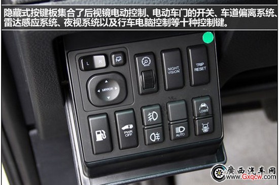 方向盤的樣式和大7 SUV相同各種功能鍵布滿了其上彰顯功能的豐富,同樣布滿功能鍵的還有方向盤左下方的隱藏式按鍵板,它集合了后視鏡電動控制、電動車門的開關、車道偏離系統(tǒng)、雷達感應系統(tǒng)、夜視系統(tǒng)以及行車電腦控制等十種控制鍵。