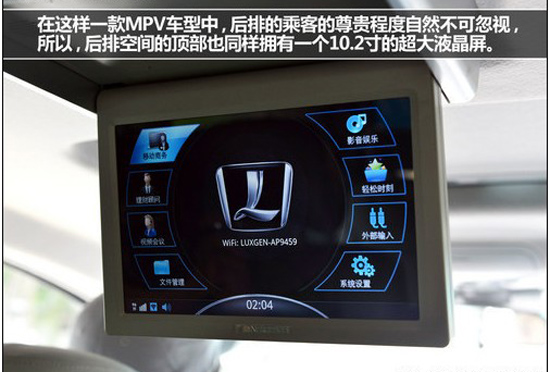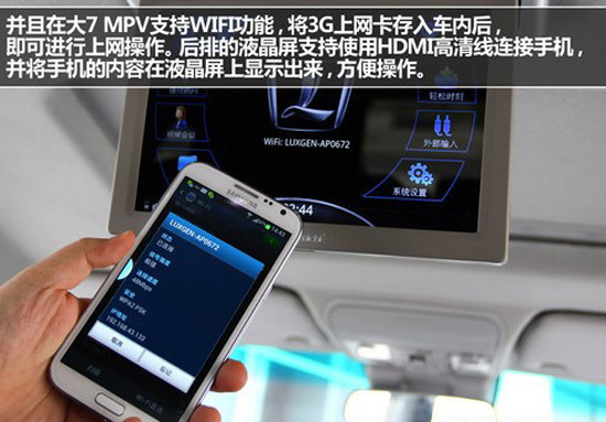 并且在大7 MPV支持WIFI功能,將3G上網(wǎng)卡存入車內(nèi)后,即可進行上網(wǎng)操作。后排的液晶屏支持使用HDMI高清線連接手機,并將手機的內(nèi)容在液晶屏上顯示出來,方便操作。