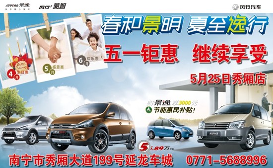 五月,5.1勞動節(jié)后,溫馨的母親節(jié),“感恩”成為5月最大的社會主旋律。為感謝廣大消費(fèi)者的關(guān)注和支持,南寧坤馳風(fēng)行秀廂4S店將5月的活動主題定為“景致春滿園 感恩答謝惠”,同時在5月25日當(dāng)天舉行專場購車活動,近期想買車的朋友們可千萬別錯過了。