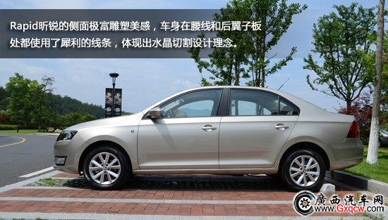 Rapid昕銳的側(cè)面造型簡(jiǎn)潔、硬朗,簡(jiǎn)練而鋒銳的線條在保持斯柯達(dá)品牌簡(jiǎn)約設(shè)計(jì)美感的同時(shí)又給人以力量感,動(dòng)感的輪轂設(shè)計(jì)則體現(xiàn)出了現(xiàn)代和典雅的交融。