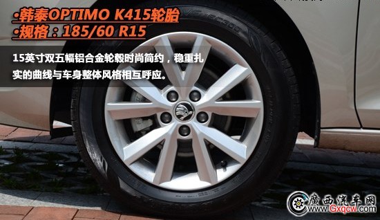 15英寸雙五幅鋁合金輪轂時(shí)尚簡(jiǎn)約,輪胎方面搭配的是規(guī)格為185/60R15韓泰OPTIMOK415輪胎,這個(gè)是一款偏重經(jīng)濟(jì)型的輪胎,耐用性相當(dāng)不錯(cuò),但是在舒適性、噪音控制、排水能力以及抓地力方面,只能算一般。另外,低配車型選用的則是14英寸的輪轂,輪胎規(guī)格為175/70R14。