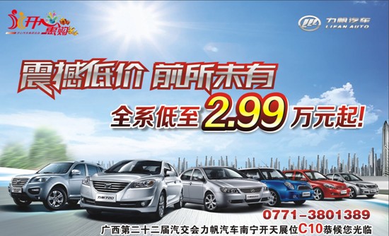 10月17日-10月20日廣西第二十二屆汽交會(huì)力帆C10號(hào)展位恭候您的光臨,同時(shí)也可以步行至車展斜對(duì)面的力帆安吉4S店內(nèi)賞車、購(gòu)車!