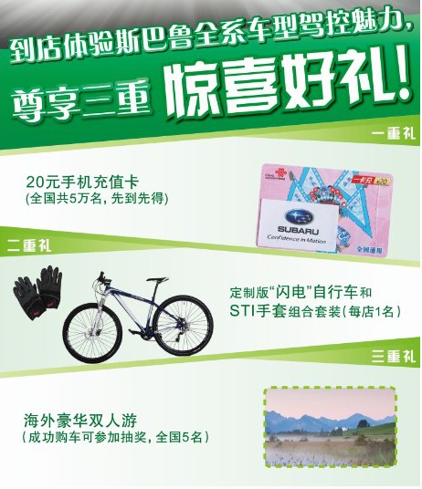 活動期間,您還可誠邀親朋到店試駕,填寫調(diào)查問卷,試駕既送電話充值卡,勁享斯巴魯?shù)鸟{駛樂趣;參與百事成斯巴魯“藍(lán)色魅惑”大抽獎,有機(jī)會獲得斯巴魯原廠STI車手手套或價值7199元美國閃電牌個性定制自行車一輛;購車的客戶更有機(jī)會獲得海外豪華雙人游套餐!
