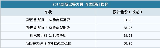 近日,網(wǎng)絡(luò)中曝光了斯巴魯2014款力獅的價(jià)格,新車(chē)總共推出4款車(chē)型,預(yù)計(jì)售價(jià)區(qū)間為24.98-36.98萬(wàn)元。 (注:該價(jià)格非最終官方售價(jià),最終車(chē)型價(jià)格還是以官方公布為準(zhǔn)。)