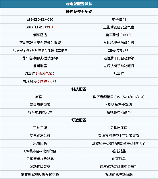 從標(biāo)準(zhǔn)版的配置可以看出,紳寶D50全系標(biāo)配了ABS+EBD+EBA+CBC、倒車?yán)走_(dá)、后霧燈、LED高位制動(dòng)燈、兒童安全鎖/座椅裝置以及后視鏡電調(diào)調(diào)節(jié)和內(nèi)后視鏡手動(dòng)防眩目等配置。標(biāo)準(zhǔn)版上還提供了兩種選裝包,選裝包①為怠速啟停配置,此乃全系均可選裝;選裝包③是前霧燈,僅在標(biāo)準(zhǔn)版上為選裝配置。舒適性方面配備了手動(dòng)空調(diào)、正副駕駛6向和4向手動(dòng)調(diào)節(jié)以及后排座椅4/6放倒和發(fā)動(dòng)機(jī)隔音棉等功能。另外,標(biāo)準(zhǔn)版提供了手動(dòng)擋和CVT兩種車型,售價(jià)分別為7.48萬(wàn)和8.98萬(wàn)元,二者差距了1.5萬(wàn)元。配置方面CVT車型有更多的選擇,其中紳寶的NOVA-LINK系統(tǒng)和倒車影像都只在這款車型上有配備。