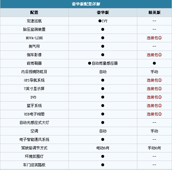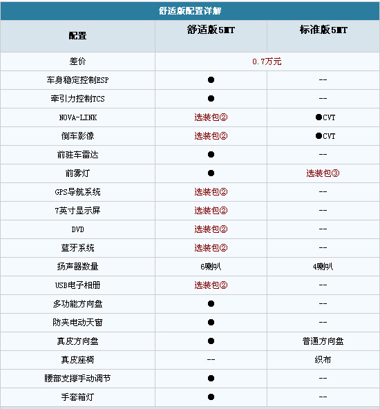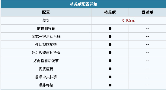 精英版和舒適版一樣都只有5MT一款車型,售8.98萬(wàn),比舒適版多出了8000元。除了標(biāo)配的主副駕駛安全氣囊,又增加了前排側(cè)氣囊,安全更可靠。智能一鍵啟動(dòng)系統(tǒng)、外后視鏡加熱/電動(dòng)折疊以及真皮座椅和方向盤前后調(diào)節(jié)等配置的加入能為車主行車提供更多的便利和舒適。