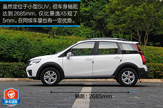 景逸X3在車身尺寸方面比景逸系列車型都要小得多,4382/1828/1705mm的長寬高和2685mm的軸距與X5相比,長度相同,其余都要略小。