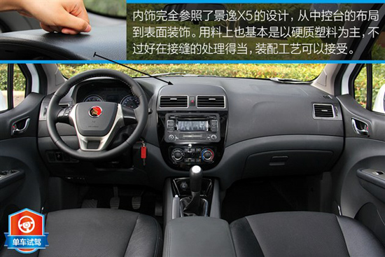 內(nèi)飾設(shè)計(jì)照搬了X5的原貌,簡(jiǎn)單規(guī)整。三幅式方向盤搭配了銀色裝飾,還集成了音響控制按鍵。儀表盤樣式簡(jiǎn)單,讀數(shù)清晰。在用料方面也與景逸X5相似,均為硬質(zhì)塑料?上Ш笈诺装逋蛊饑(yán)重,7CM的隆起高度對(duì)中間乘客的腿部舒適性產(chǎn)生一定的影響。