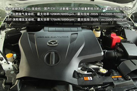 動力方面,國產(chǎn)馬自達(dá)CX-7將搭載2.3T發(fā)動機(jī)或者2.5L自然吸氣發(fā)動機(jī)可選,前者最大功率為238Ps(175kW),峰值扭矩為350N?m,傳動系統(tǒng)與之匹配的是5速手自一體變速箱;后者最大功率為163Ps,峰值扭矩為205N?m,傳動系統(tǒng)與之匹配的是6速手自一體變速箱。另外,新車將提供前驅(qū)版和四驅(qū)版車型供消費(fèi)者選擇。