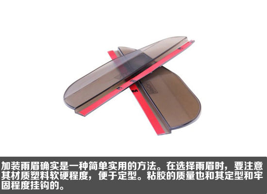 在后視鏡上加裝雨眉確實(shí)是一種簡(jiǎn)單實(shí)用的方法。雨眉的安裝方式通常分外側(cè)安裝和內(nèi)側(cè)安裝。外側(cè)是粘在后視鏡上的,而內(nèi)側(cè)則是插在插在后視鏡與框的縫隙中。實(shí)際使用中都是外側(cè)安裝的多,裝在內(nèi)側(cè)的話因?yàn)橛昝己穸鹊脑,可能?huì)影響到后視鏡本身的調(diào)節(jié)。但是值得注意的是,在選擇雨眉時(shí),要注意其材質(zhì)塑料軟硬程度,便于定型。粘膠的質(zhì)量也和其定型和牢固程度掛鉤的,質(zhì)量差膠被雨水侵蝕后,不僅容易掉,而且定性不好影響美觀。
