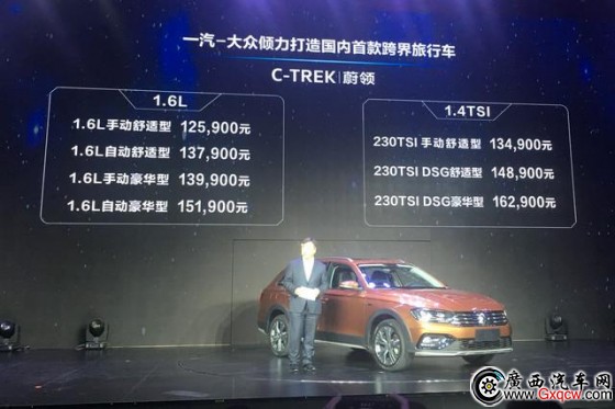 2016年11月3日,一汽-大眾基于PQ34平臺的首款跨界休旅車C-TREK蔚領(lǐng)在麗江雪山下正式上市,新車共推出搭載1.6L和1.4TSI發(fā)動機(jī)的7款車型,售價12.59-16.29萬元。蔚領(lǐng)的車型名稱與大眾進(jìn)口旅行車蔚攬組成家族化命名方式,作為一汽-大眾推出的首款A(yù)級跨界旅行車,蔚領(lǐng)擁有著大空間、多功能和良好的通過性的優(yōu)點(diǎn),可以滿足親朋好友一起長途旅行的需求。