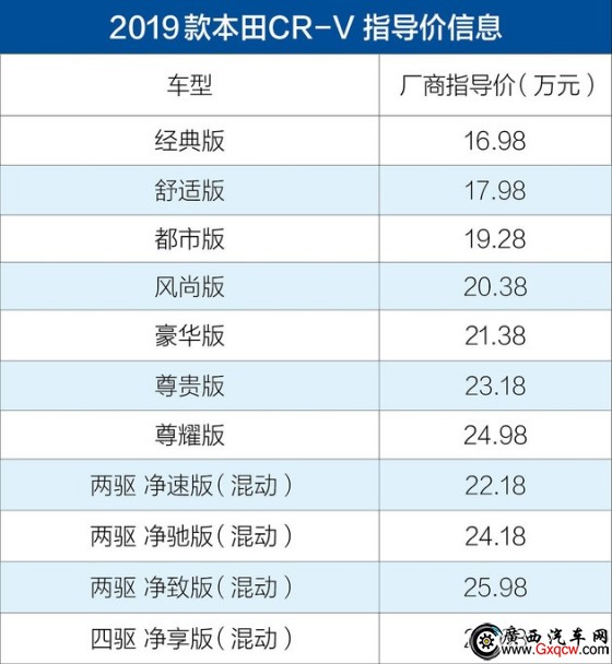 (廣西汽車網(wǎng) 訊)10月11日,2019款本田CR-V在武漢車展上正式上市,新車售價(jià)區(qū)間為16.98-27.68萬元,共推出11款車型。新車作為年度改款車型在外觀配置方面均與現(xiàn)款保持一致,僅針對配置方面進(jìn)行了升級(jí),此外還新增了四驅(qū)混動(dòng)版車型。
