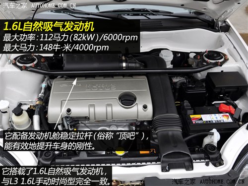 花L3車身外型采用“邊沿激流動力學(xué)”減少了車身風(fēng)阻, “車頂拱橋力學(xué)”線條設(shè)計,讓整體車身華麗時尚,動感十足,符合現(xiàn)代車友對于時尚動感的外觀審美需求。作為青年蓮花與英國蓮花科技合作三年,精心打造一款成熟車型,蓮花L3傳承了英國蓮花優(yōu)秀技術(shù),整體車身采用50:50的黃金比例重量分配,擁有原裝進口的Campro1.6L高轉(zhuǎn)速發(fā)動機,*大功率為82kW,*大扭矩為148Nm,蓮花L3搭載的此款發(fā)動機,轉(zhuǎn)速高達(dá)7000轉(zhuǎn)以上才會出現(xiàn)斷油保護,轉(zhuǎn)速只要在4000左右就可以達(dá)到*大扭力。
