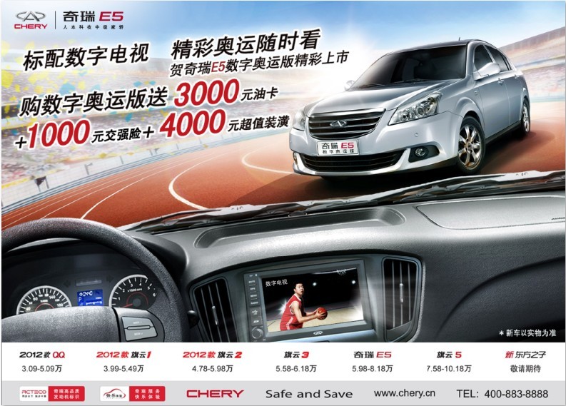 在2012年倫敦奧運(yùn)會(huì)即將開啟之際,自主家轎市場(chǎng)炙手可熱的“人本科技中級(jí)家轎”——奇瑞E5提前發(fā)力,于近日正式推出奇瑞E5數(shù)字奧運(yùn)版,讓愛(ài)好體育的駕車人士把奧運(yùn)節(jié)目輕松“搬”進(jìn)車內(nèi),隨時(shí)隨地觀賞高清畫質(zhì)數(shù)字奧運(yùn)賽事。奇瑞E5數(shù)字奧運(yùn)版市場(chǎng)價(jià)為69800元,現(xiàn)在購(gòu)車即可享3000元加油卡及1000元交強(qiáng)險(xiǎn),更有4000元超值裝潢大禮奉送,感興趣的消費(fèi)者可垂詢柳州奇瑞4S店