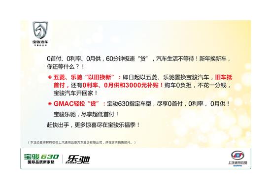 更有“幸福O首付 寶駿輕松貸”新年專(zhuān)項(xiàng)車(chē)貸活動(dòng),讓你“馬”上有車(chē),只要到白沙景茂寶駿店,包你心想事成!