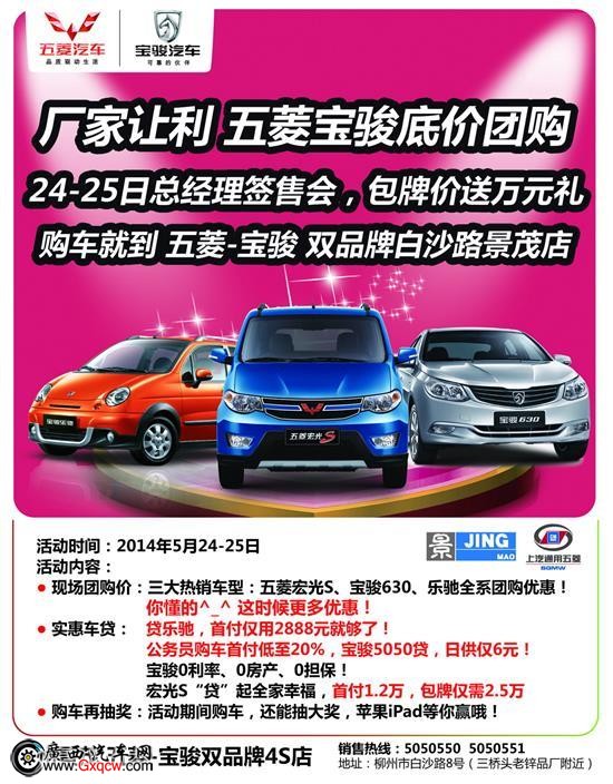 作為柳州人驕傲的本土品牌寶駿,近水樓臺先得月,廠家大幅讓利,在5月24-25號上午10:00時,景茂寶駿4S店將舉行盛大的總經(jīng)理簽售會活動!