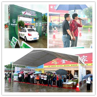 比賽前幾日,天空一直陰沉低靡。到了比賽當日,老天好像要和提前到場的車友們過不去似的,紅地毯還未鋪好,瓢潑大雨傾盆而下!突然變故的天氣讓工作人員有點手足無措,但好在有善解人意的車迷和媒體朋友的幫助,活動得以順利的進行下去……