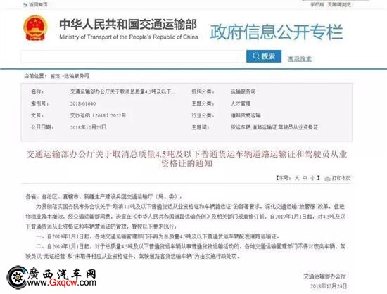 12月25日,在廣大輕卡俠的殷切期盼下,交通運輸部正式下發(fā)通知,自2019年1月1日起,取消總質(zhì)量4.5噸及以下普通貨運車輛道路運輸證和從業(yè)資格證。
