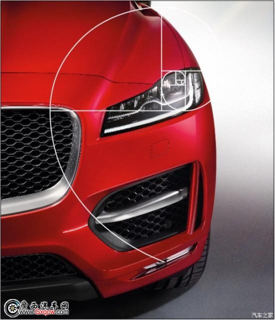 肌肉感十足的引擎蓋成功地分割了由玻璃帶來的視野局限,將捷豹F-PACE完美前臉定格在0.618:1的畫面中。