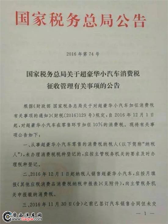 1月30日晚,財(cái)政部網(wǎng)站公布《關(guān)于對(duì)超豪華小汽車(chē)加征消費(fèi)稅有關(guān)事項(xiàng)的通知》。據(jù)國(guó)家稅務(wù)總局網(wǎng)站消息,財(cái)政部、國(guó)家稅務(wù)總局今日下發(fā)關(guān)于對(duì)超豪華小汽車(chē)加征消費(fèi)稅有關(guān)事項(xiàng)的通知。通知指出,對(duì)超豪華小汽車(chē)加征10%的消費(fèi)稅。