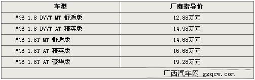 12月22日,新基準(zhǔn)轎車(chē)MG6正式上市銷售,推出了五款不同型號(hào)的車(chē)型,售價(jià)12.88-19.28萬(wàn)元。目前在4S店已經(jīng)開(kāi)始接受預(yù)定,訂金5萬(wàn)明年1月提車(chē)。
