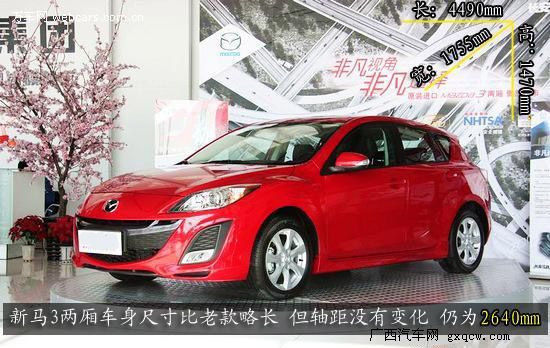 首先我們來看看車身尺寸,新馬自達(dá)3兩廂軸距沒有變化仍為2640mm,但長寬高均有增長。老款的三圍為4415mm/1745mm/1465mm,新款為