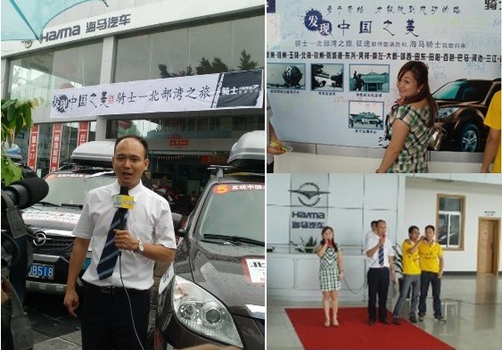 騎士車隊(duì)抵達(dá)海馬海康十年老店舉行的慶祝儀式,?蹈笨傊x富寧接受記者了記者的訪問