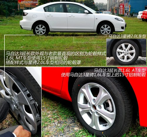 新推出的馬自達3延長款外觀上的改動不多,主要是對于輪轂的樣式與大燈內(nèi)部進行調(diào)整。老款經(jīng)典版車型上的鋁制輪轂在新款1.6MT車型上變成15寸鋼制輪轂,并使用鋁塑材質(zhì)的輪轂罩,樣式更像星騁2.0L車型的簡化版。而兩款1.6AT車型則使用星騁15寸鋁制輪轂,樣式卻與星騁1.6L車型保持一致。延長版四款配置車型仍使用固特異品牌的輪胎,星騁則全系標配了錦湖品牌的輪胎。