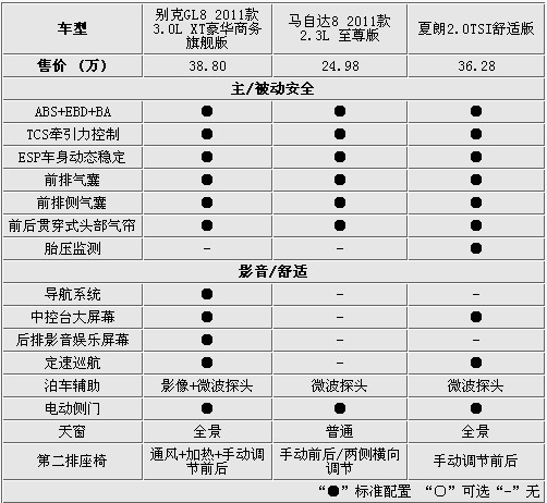 配置方面三車都裝備了電動門,這點作為商務(wù)MPV來說很有必要,因為在更小一個級別的MPV車 型中也都有配置。MPV車型有載人多的特色,所以在主被動安全方面三車都裝備的很齊全,保證安全性,夏朗還配置了胎壓監(jiān)測系統(tǒng),細節(jié)之處很用心。MPV寬 大的車身對于泊車來說有些不便,但是三車都裝備倒車雷達,GL8還配置了倒車影像功能,但是夏朗雖然有屏幕但是并沒有配置倒車影像。全景天窗除過馬自達8 都有配置,增加車內(nèi)成員的采光和開揚感。