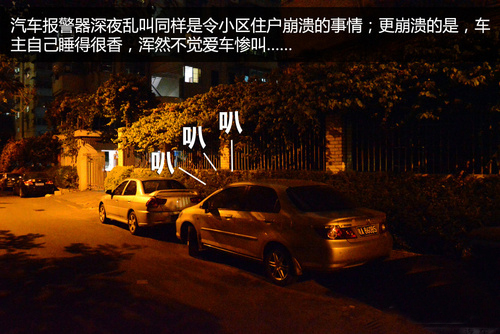 除了深夜鳴喇叭惹人厭外,汽車報警器深夜擾民也是很令小區(qū)居民頭痛的現(xiàn)象。晚上停放在小區(qū)的汽車很多,一些安裝了報警器的汽車,被小貓小狗輕輕一碰,或附近的聲音稍微大些,就會叫個不停,在深夜聽見那急促刺耳的聲音,簡直讓人崩潰。
