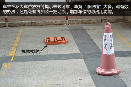 解決方法:指望物管人員幫忙看管私人車位顯然不切實際,車主可在自己的車位上擺放樁筒等障礙物,以防止他人占用;最有效的方法還是加裝一把地鎖,雖然投入較大,但效果最好。當然,要徹底消除這種行為,就需要車主們自覺,不占用私人車位,從自身做起,顧己及人。