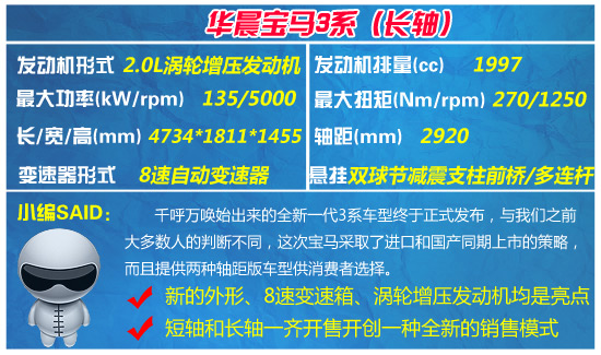 全新寶馬3系終于在7月份在眾人的期待中隆重上市,全系31.6萬元起的售價配合其主要的升級來看也還算是可以接受,而且之前大家廣泛猜測的新車加長問題,寶馬也用全新的國產(chǎn)/進口對應的長軸/短軸版車型給了我們一個很好的回應,而且短軸版進口車型的整車性價比甚至比國產(chǎn)的長軸版還要高,對于仍舊喜歡原汁原味的寶馬系列的消費者來說,購買進口版車型無疑是個不錯的選擇,而對空間有更高追求的消費者來說,國產(chǎn)加長版本的長軸版車型則是一個更好的選擇。