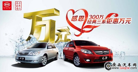 (廣西汽車網(wǎng) 訊)為慶祝比亞迪全系車型銷量即將突破300萬(wàn)輛, 3系車型銷量超過(guò)160萬(wàn)輛,比亞迪自即日起開(kāi)展“感恩300萬(wàn) 經(jīng)典3系鉅惠萬(wàn)元”活動(dòng),以回饋廣大消費(fèi)者。本次鉅惠幅度大、涵蓋車型廣,覆蓋L3、G3及經(jīng)典F3等多款車型,最高優(yōu)惠達(dá)萬(wàn)元,產(chǎn)品性價(jià)比進(jìn)一步提升。