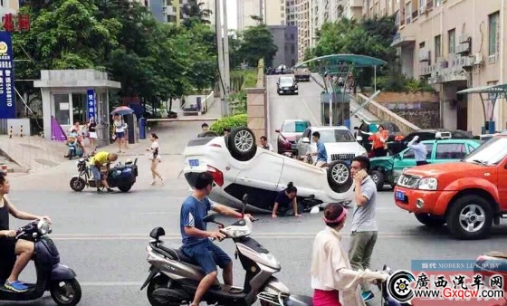 兩車在平路上發(fā)生碰撞,其中一輛竟然被掀翻了,這是怎么回事?7月3日上午,在南寧市鳳翔路上,一輛私家車與一輛出租車發(fā)生碰撞,出租車的左前輪位置被撞凹,而私家車卻四輪朝天躺在路面上。
