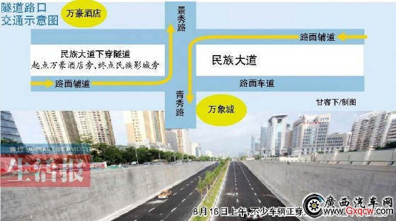 8月16日上午,南寧市民族大道下穿青秀路隧道順利通車(chē),青秀路與景秀路對(duì)行交通同時(shí)恢復(fù)。