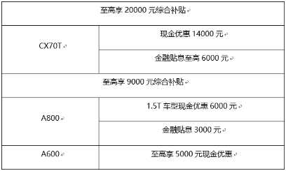 另外,長安歐尚此次汽車下鄉(xiāng)參與補(bǔ)貼的車型還有CX70T、A800、A600三款高品質(zhì)車型。其中CX70T最高可享20000元綜合補(bǔ)貼,A800最高可享9000元綜合補(bǔ)貼,A600最高可享5000元現(xiàn)金優(yōu)惠。